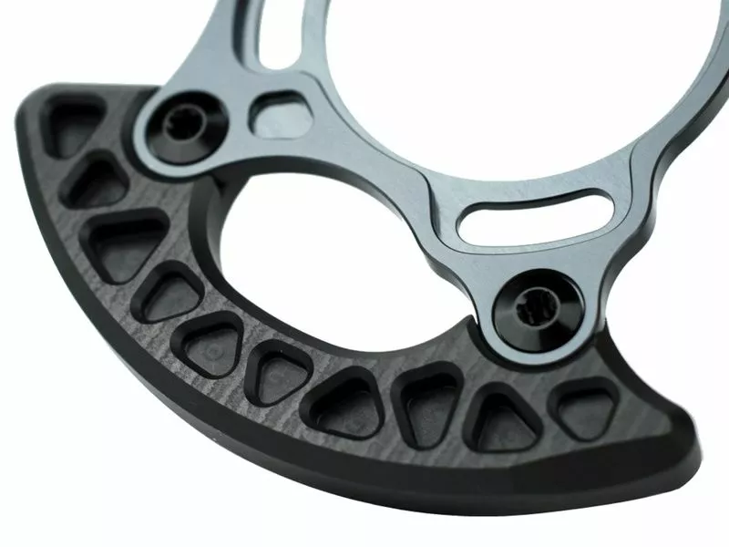 Le guide chaine Absolute Black Taco est la solution idéale pour ceux qui veulent prortéger leurs plateaux mais qui n’ont pas la possibilité d’installer un protège plateau traditionnel à 4 trous de fixation. Le bashguard Taco a été développé pour protéger vos plateaux des obstacles du terrain (racines, rochers …) Installé derrière le pédalier et fixé sur les plots ISCG 05 il permet de protéger tout type de plateaux : direct mount , standard 4 trous ou encore ovales.