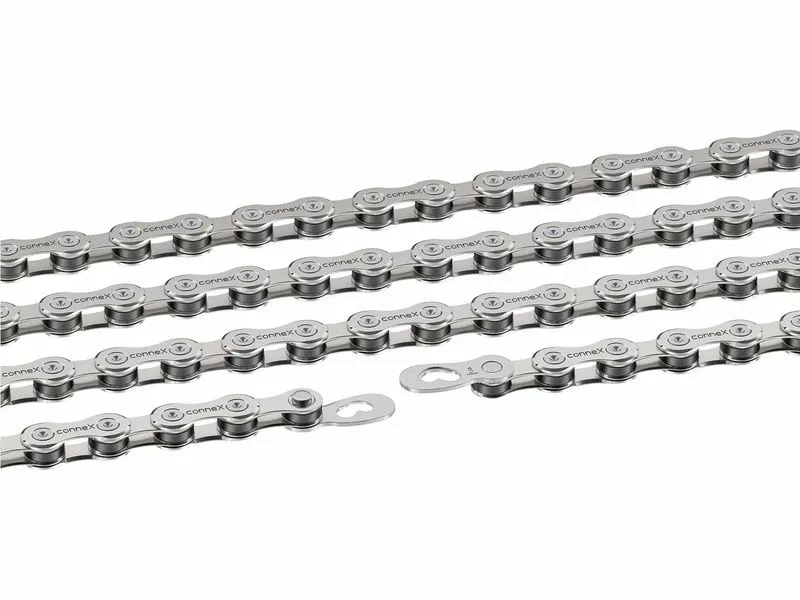 Les chaines 9 vitesses de chez Connex sont toutes compatibles avec l’ensemble des marques de transmission route ou VTT du marché, mais elles bénéficient de nombreux atouts supplémentaires face à leur concurrents. Tout d’abord le design unique des plaques externes de maillons qui assurent une transmission parfaite tout en douceur. Concernant la 908, le revetement extérieur des maillons est en nickel comme sur la 9sX dans le but d’augmenter sa resistance à l’usure en conditions humides! Toutes les chaines Connex sont livrées avec l’attache rapide qui permet de monter la chaine sans aucun outil et qui en facilite par conséquent l’entretien.