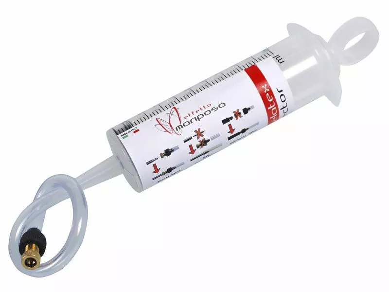 La seringue d’injection Caffélatex Injector Effetto Mariposa se compose d’un long tuyau flexible et d’une seringue permettant de contrôler l’injection du préventif Caffélatex de manière précise, facile et propre. Il fonctionne avec les valves Shrader et Presta (avec ou sans l’obus de la valve).