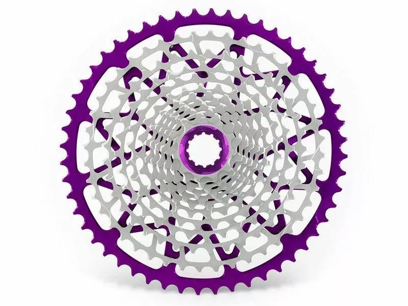 La cassette Garbaruk Standard HG 12 vitesses bénéficie d’une grande qualité de fabrication et vous permet de bénéficier d’un ratio de 520% (11-52 dents) tout en gardant votre roue équipée d’un corps de roue libre Standard HG. A la fois légère et accessible, elle offrira un haut niveau de performances à votre transmission 12 vitesses. Compatible uniquement avec les corps de roue libre type Standards type Shimano HG, cette cassette est fabriquée à partir d’un seul et même bloc d’acier pour les 11 premiers pignons. Le dernier pignon est quant à lui réalisé en aluminium 7075 anodisé ici en couleur Violet. Disponible en 11-52 dents, la cassette Garbaruk vous offrira une grande précision de changement de vitesses, un poids plume, et une excellente durabilité. Garbaruk recommande de coupler cette cassette avec un dérailleur Shimano 1×12 vitesses chape longue (SGS) afin de bénéficier du plus haut niveau de précision mais la marque indique que sa cassette sera aussi compatible avec les dérailleurs Sram 1×12 vitesses. Cerise sur le gâteau elle offrira à votre vélo un look incomparable grâce à son anodisation violet surtout si vous optez pour les chapes de dérailleur et galets pour dérailleurs Sram et Shimano aussi disponibles dans la même couleur d’anodisation.