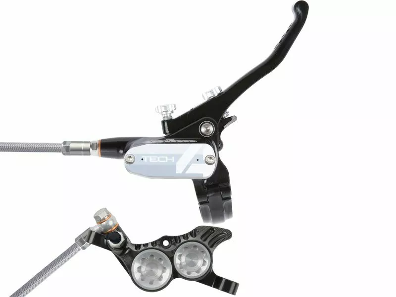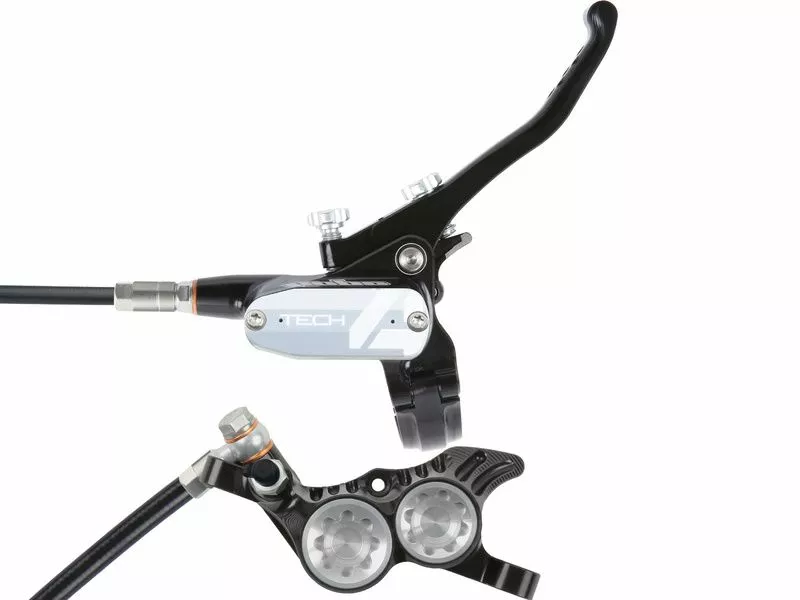 Son maitre cylindre est maintenant équipé de pivot levier monté sur roulements à billes et de nouveaux joints internes réduisant les frictions. L’augmentation de la démultiplication du levier d’environ 30% offre un meilleur feeling et une plus grande puissance tout en réduisant la fatique musculaire. La fixation du maitre cylindre du Tech 4 sur le guidon se fait par un système de collier à charnière très facile d’installation et compatible avec la fixation directe des commandes Shimano ISPEC EV et SRAM Matchmaker en utilisant des adaptateur vendus séparément. Toujours d’actualité, les vis BPC et Reach Adjust permettent d’ajuster la garde du levier et le contact plaquettes sans outil .