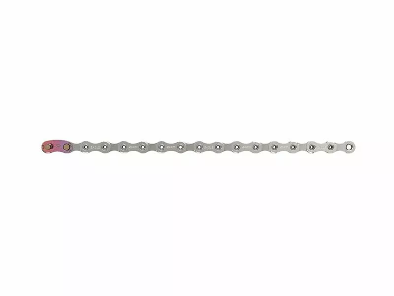 La chaine Sram PC X01 Eagle 12 vitesses a été totalement repensé par rapport au modèle 11 vitesses. Visuellement elle est reconnaisssable grâce à sa finition noire ou or et à son attache rapide en forme de banane, mais le plus marquant vient de la nouvelle tecnhologie utilisée pour la construction de cette chaine, le Flow Link. En effet avec le Flow Link la chaine XX1 Eagle n’a plus de bords à angle droit, ce qui réduit à la fois les frictions, le bruit et l’usure, non seulement de la chaine mais aussi de la cassette et du plateau.