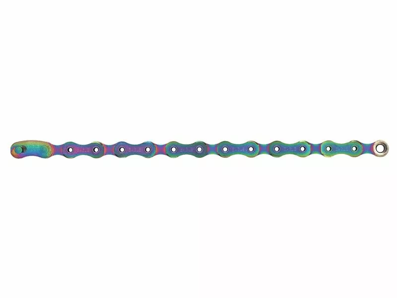 La chaine PC XX1 Eagle de Sram dispose d’une toute nouvelle conception basée sur la technologie FlowLink. Les maillons n’ont plus d’angle saillant ni de chanfrein pour obtenir des plaques plus plates. Ainsi le rivetage est plus solide, plus précise, plus silencieuse et plus durable. Elle est reconnaissable grâce à ses 3 finitions spécifiques noire, or et « Rainbow » et est livrée avec une attache rapide PowerLock 12 vitesses non réutilisable en forme de banane.