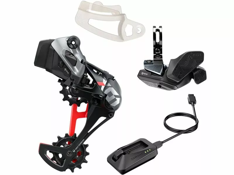 Envie de passer au sans fil sans vous ruiner ! Alors le kit de mise à niveau Sram X01 AXS Rocker est fait pour vous. Le dérailleur ici en couleur Rouge ressemble à la version totalement mécanique mais la conception de ce X01 AXS a été totalement repensée pour intégrer le moteur et la batterie. Il est également plus compact avec une garde au sol relevée pour être moins exposé et il est équipé de la toute nouvelle technologie Overload Clutch qui permet au dérailleur de débrayer pour “absorber” en cas de choc et de retrouver sa position en une fraction de seconde. La batterie, commune à toute la gamme AXS (Route, VTT, Reverb), se place à l’arrière du dérailleur et son installation/désinstallation est très simple. L’autonomie annoncée est d’environ 15-20h. La commande de vitesses est compacte et son design est aussi sobre que son utilisation est simple. Une légère pression du pouce vers le haut ou vers le bas suffit pour changer de vitesses et le réglage de la position est assez large. Mais surtout le gros avantage de cette transmission AXS c’est la simplicité d’installation surtout pour ceux qui ont un passage interne de gaine… Comme souvent cette gamme X01 est destinée aux pratiques plus engagées. L’Application Sram AXS disponible sous Android / IOS.