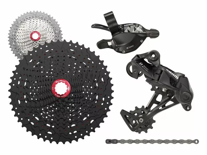 Le groupe Sram NX 1X11 vitesses est ici combiné à la cassette Sunrace MX8 11 vitesses noir disponible en 11-42 dents et 11-46 dents pour encore plus de polyvalence.